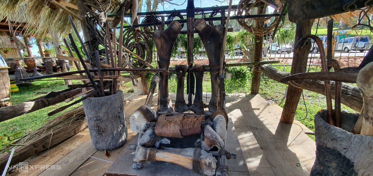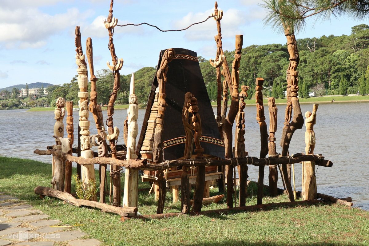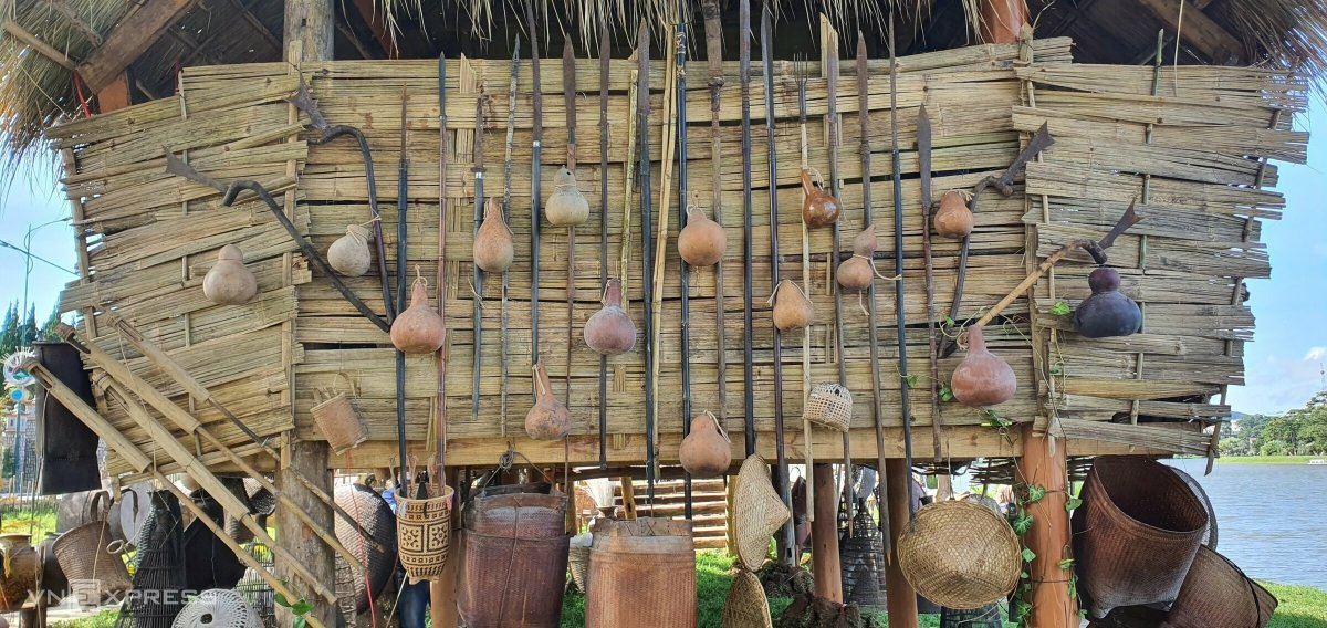 Một không gian Tây Nguyên với nhà dài, nhà rông, cồng chiêng, nhà mồ, sản vật... được tái hiện bên hồ Xuân Hương, TP Đà Lạt.