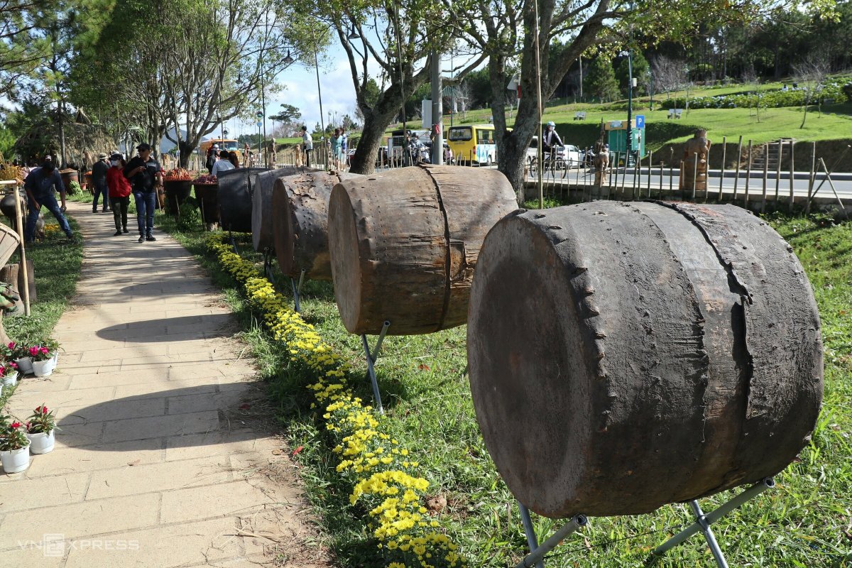 Dàn trống da trâu được trưng bày trong không gian Thiên đường Tây Nguyên. Đây là trống để người dân Tây Nguyên sử dụng trong các lễ hội, lễ nghi... truyền thống.