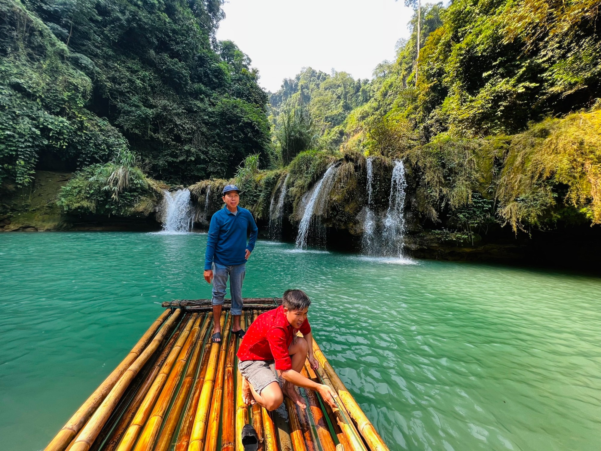 Chiếc bè kéo dây được chuẩn bị sẵn ở tầng thác thứ 2. Với 10.000 đồng/người, bạn có thể tự đẩy bè ra vùng gần thác nước và tạo 1 album "sống ảo" tuyệt đẹp