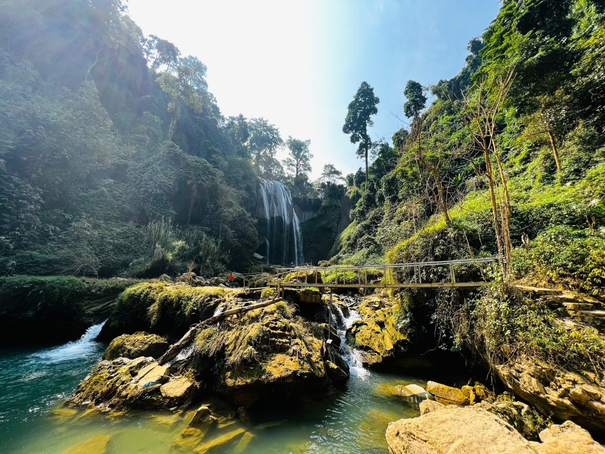 Đi qua đoạn cầu gỗ, rừng mở rộng ra một vùng thoáng đãng và trong tầm mắt các bạn chính là ngọn thác
