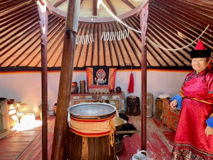 Bên trong một căn lều của dân du mục Mông Cổ. Mùa du lịch Mông Cổ bắt đầu từ tháng 5 đến tháng 10, trong đó mùa đẹp nhất và cao điểm là mùa thu tháng 9 khi các đồng cỏ bắt đầu chuyển màu từ xanh sang vàng và thời tiết mát dịu. Tôi sẽ nhớ mãi chuyến đi này bởi sau 3 năm ở nhà vì đại dịch, đi để biết thêm nhiều cái mới, học thêm nhiều cái độc đáo, để giao lưu văn hóa giữa hai quốc gia và để có thêm những người bạn mới.