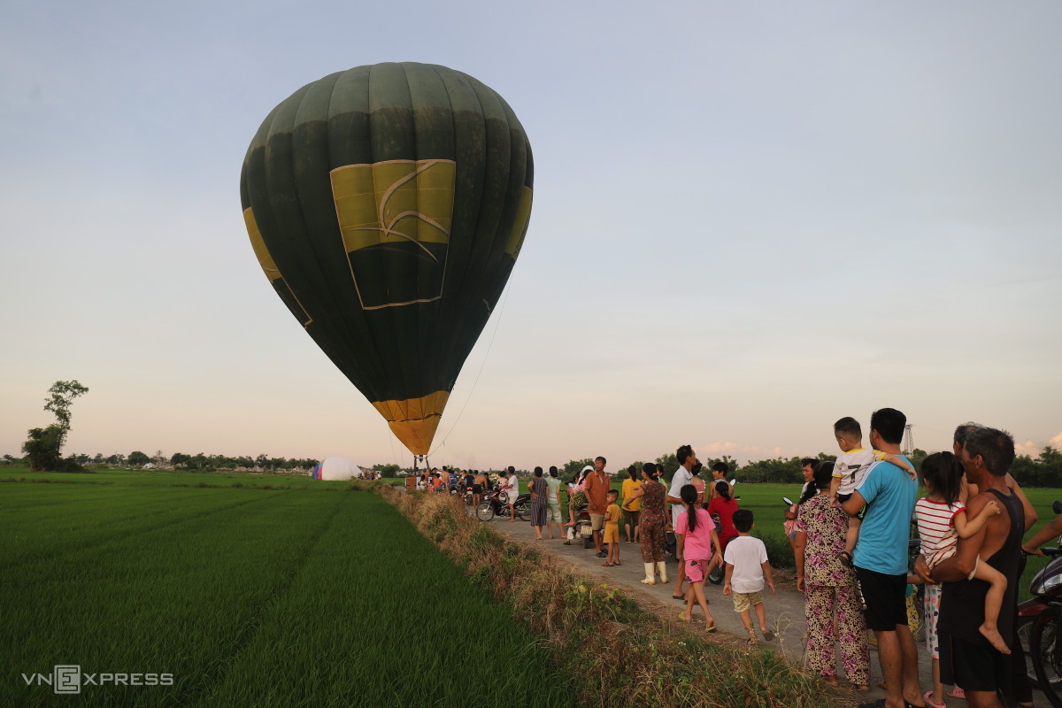 Sau khoảng 30 phút, khinh khí cầu hạ xuống cánh đồng làng Tiên Nộn cách đó khoảng 5 km. Người dân ở làng Tiên Nộn xã Phú Mậu, TP Huế thích thú khi lần đầu nhìn thấy khinh khí cầu đáp xuống làng mình.
