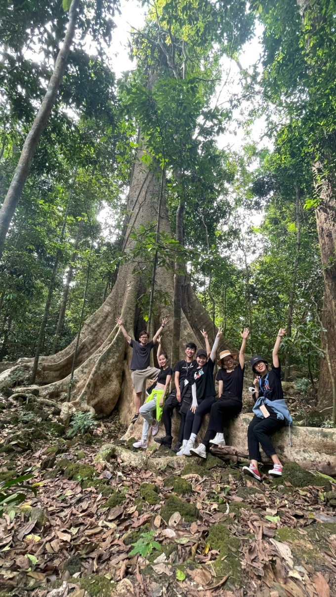 Nhóm bạn chụp hình bên cây cổ thụ 400 tuổi trên cung đường rừng. Ảnh: NVCC Lưu ý