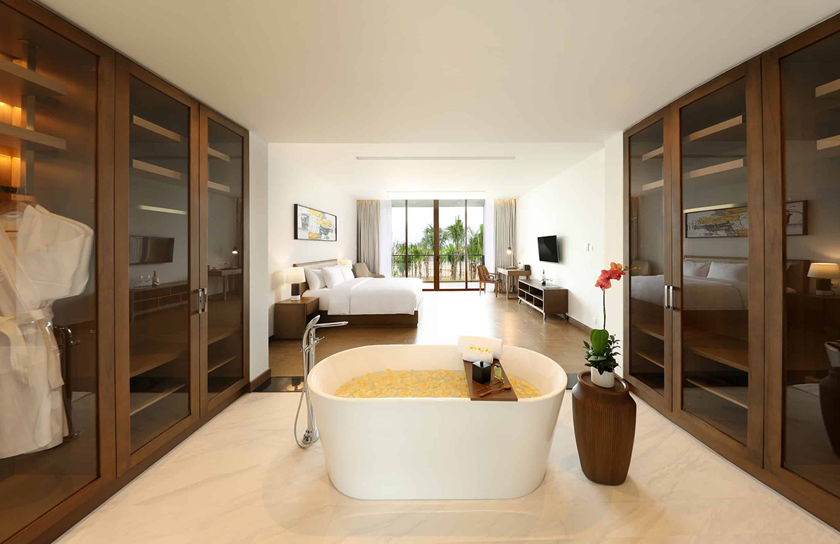 Các villa được thiết kế với không gian rộng rãi, điểm nhấn là bồn tắm ở giữa phòng. Điểm trừ là các phòng khó nhìn thẳng ra vịnh Hạ Long, tuy nhiên, nếu muốn ngắm vịnh, bạn có thể đi dạo trên các đường lớn trong khuôn viên của khu nghỉ dưỡng. Một đêm nghỉ tại đây có giá từ 8,7 triệu đồng cho một biệt thự nguyên căn. Ảnh: Khu nghỉ dưỡng