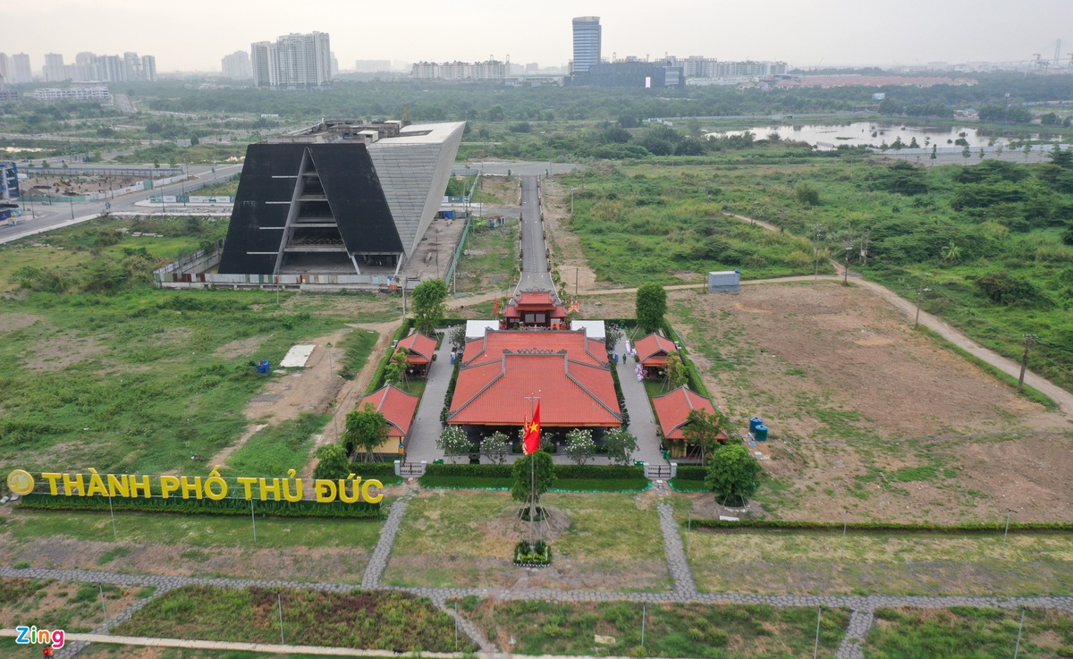 Từ cổng đình được xây dựng theo lối tam quan truyền thống với hai tầng mái, mọi người có thể nhìn thấy các công trình biểu tượng của TP.HCM thấp thoáng đằng sau như tòa nhà Bitexco, công viên Bến Bạch Đằng...