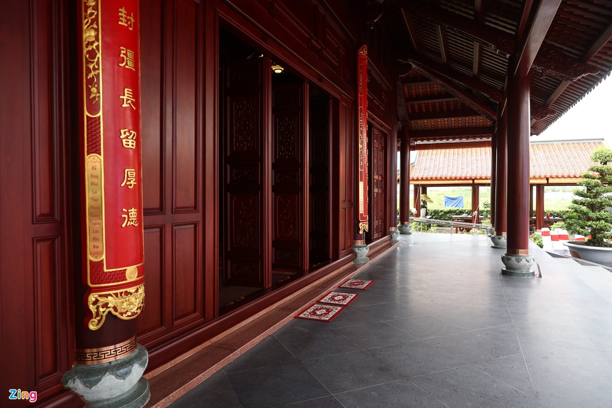 Phần tường được dựng hoàn toàn bằng gỗ. Hệ thống trụ có bệ đá đồng bộ với sàn bên ngoài chánh điện.