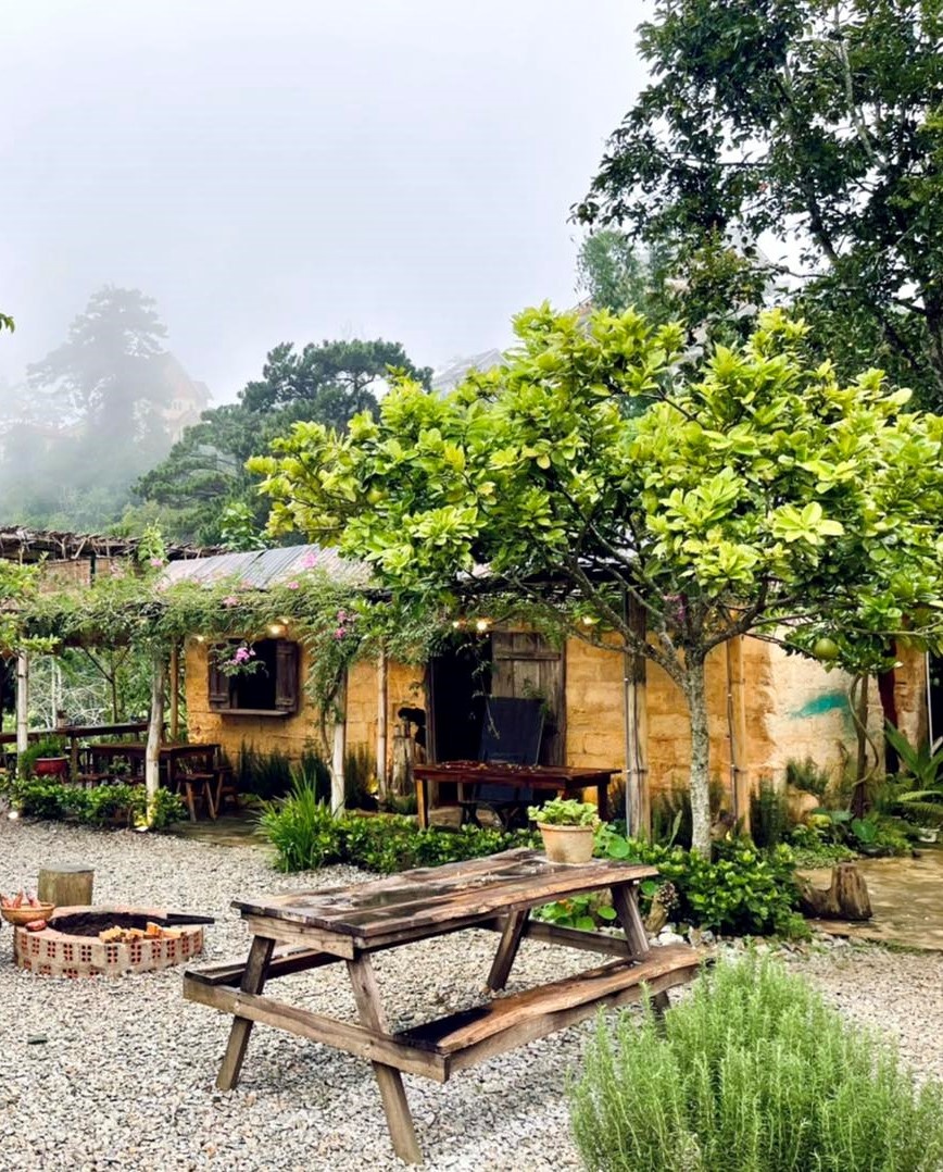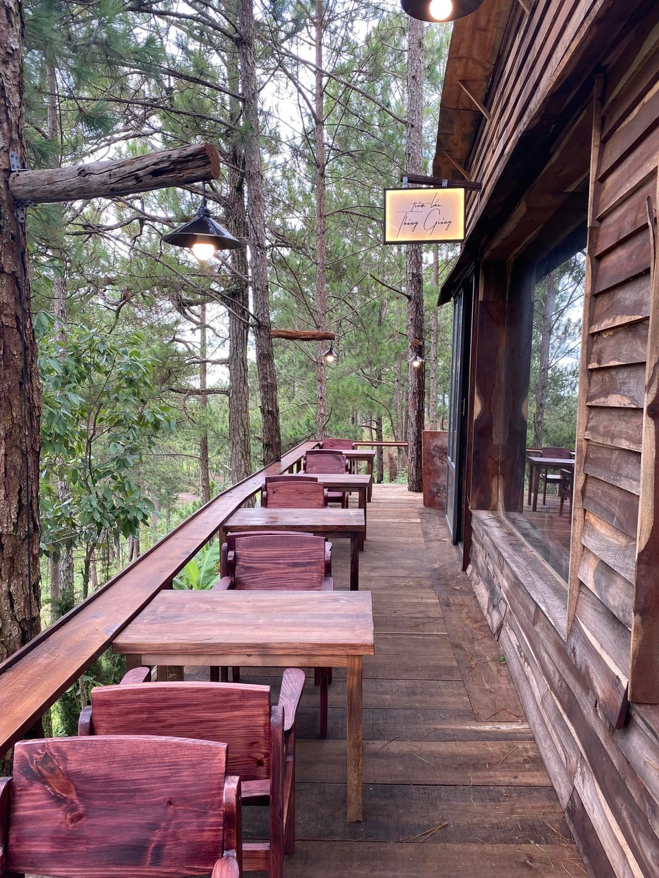 Quán có vị trí đắc địa ở giữa rừng thông. Ảnh: Thông Giông. Quán mang tông màu nâu ấm cúng, có không gian trong nhà rộng rãi với những ô cửa sổ lớn. Phần lớn khách đến đây đều chọn ngồi ngoài ban công để ngắm phố núi từ trên cao. Bạn phải đặt bàn trước qua fanpage của quán.