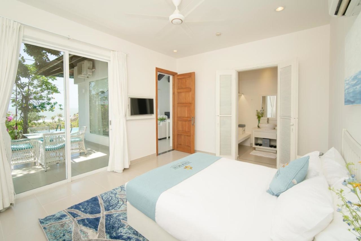 Phòng nghỉ có diện tích 45 m2 với hạng deluxe và bungalow 60 m2, tầm nhìn hướng vườn hay hồ bơi. Nơi ở tạo cảm giác thông thoáng với cửa kính trong, đón ánh sáng tự nhiên và tông màu trắng chủ đạo. Giá phòng từ 2,6 triệu đồng/đêm. Ảnh: Booking