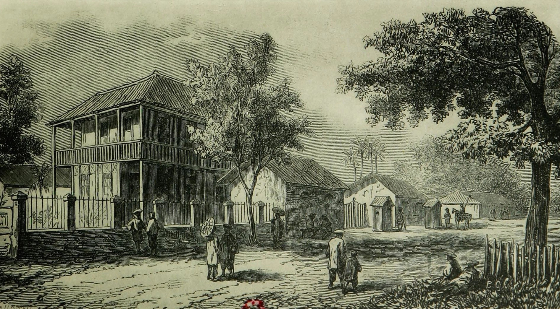 Ảnh: Iconographie historique de l'IndochineTrong bộ sách, J.C. Baurac cho rằng cái tên Sài Gòn xuất phát từ việc người dân ở đây trồng nhiều cây gòn quanh thành trì, sau thành tên gọi đô thị. Theo tác giả Description de la Basse-Cochinchine (tức Gia Định thông chí) "Sài" mượn từ một chữ Hán có nghĩa là gỗ; "Gòn" trong tiếng An Nam là tên bông gòn và cây gòn. Trong ảnh là ngôi nhà gỗ dùng làm Dinh Thống soái Nam kỳ đầu tiên.