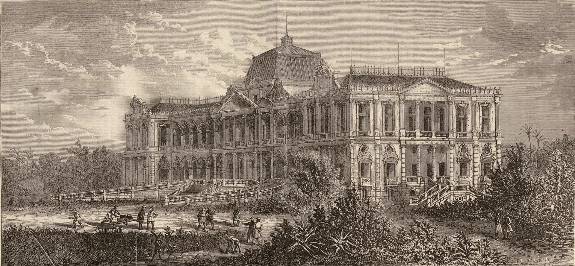 Đô thị có những con đường được kiến thiết vuông góc với hàng cây cổ thụ rợp bóng, những công trình kiến trúc, những quảng trường, đài phun nước, công viên… được dựng lên. Nơi này mau chóng trở thành một thành phố nửa Á nửa Âu với dân số khoảng 35.000 người. Trong ảnh là Phủ Toàn quyền tại Sài Gòn. Ảnh đăng trên Le Monde illustré, số ra ngày 23/2/1884.