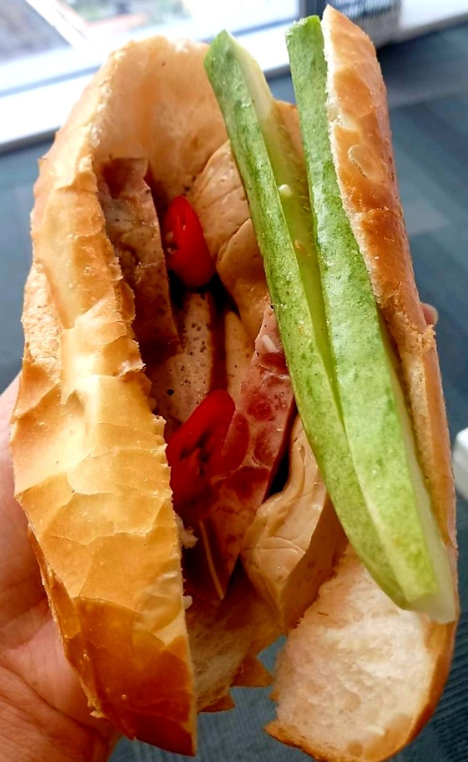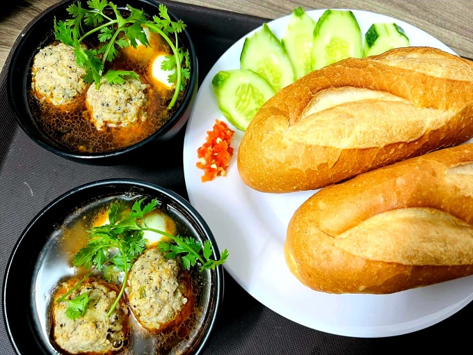 Chiếc bánh mì giòn kết hợp nhiều loại nhân như xíu mại, chả cá, thịt heo quay, bì... được nhiều người ưa chuộng.