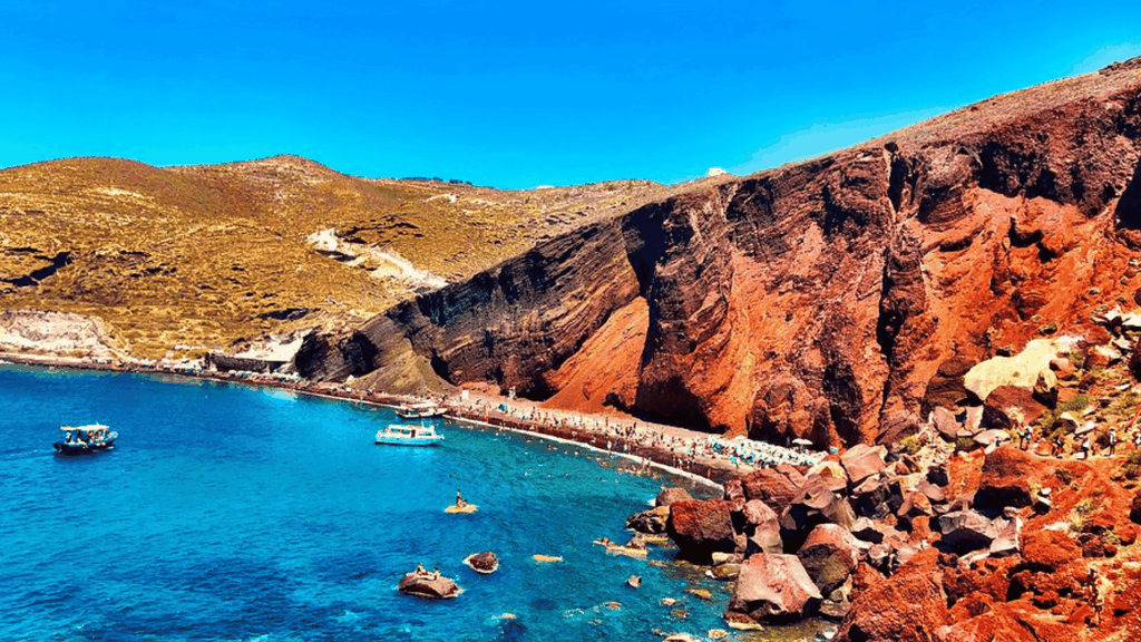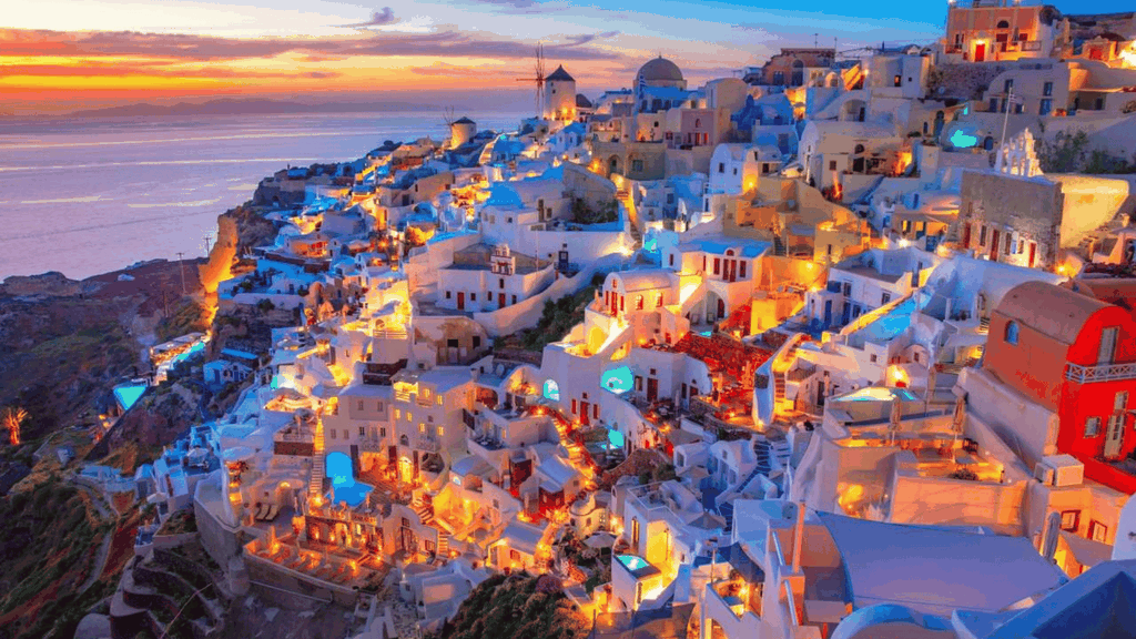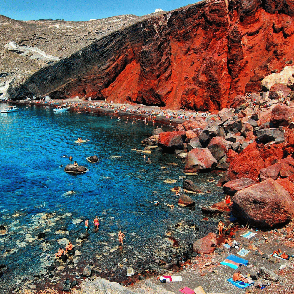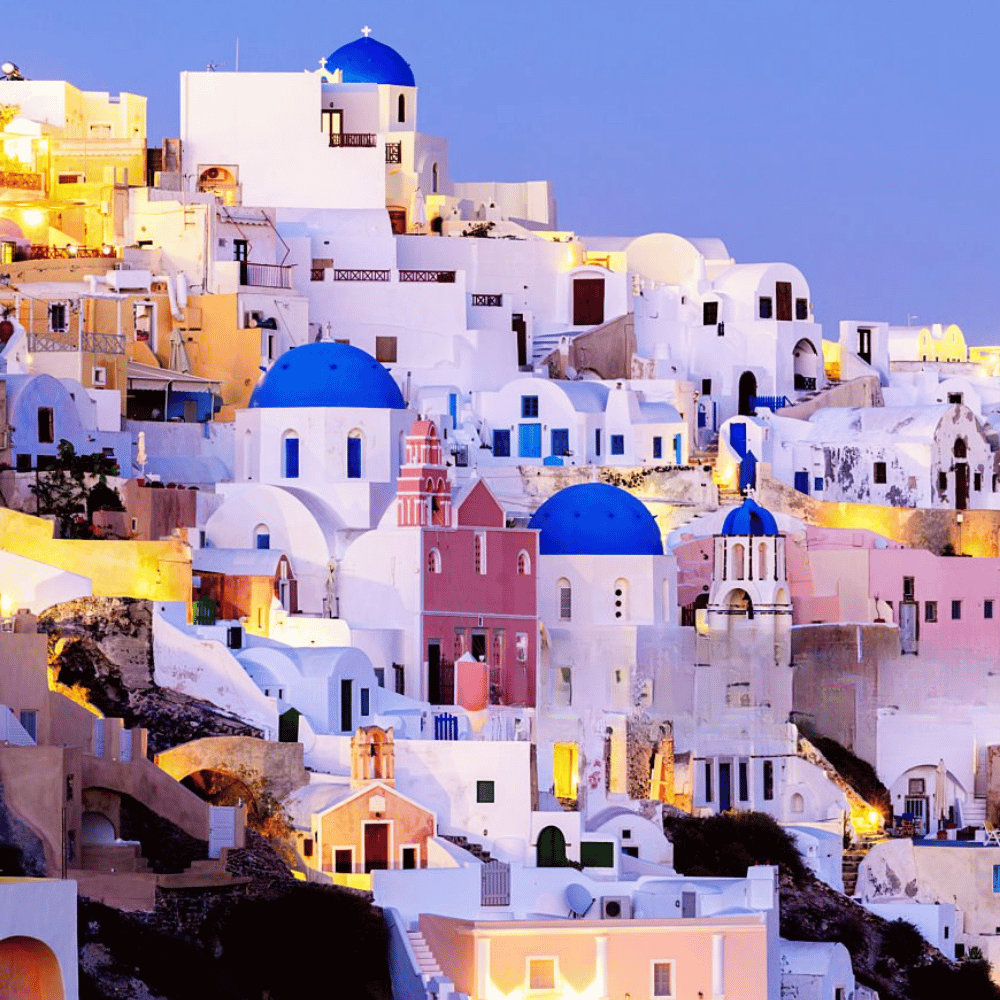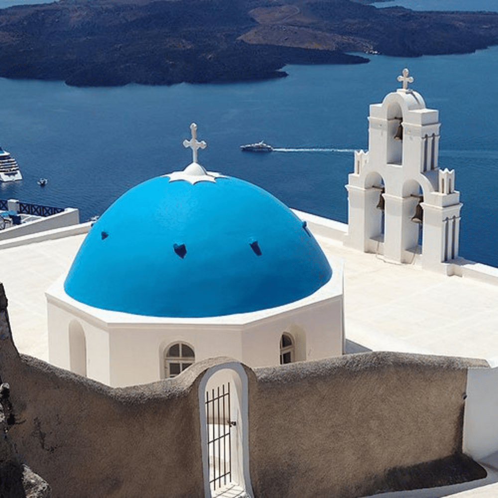 Sau bữa sáng, đoàn trả phòng, khởi hành về Athens. Đến nơi, đoàn dùng bữa trưa, sau đó di chuyển ra sân bay làm thủ tục đáp chuyến bay nội địa đi Santorini – hòn đảo nằm trên biển Aegean, nổi bật với kiến trúc nhà trắng mái vòm xanh đặc trưng nằm chênh vênh trên vách đá núi lửa. Đến nơi, đoàn di chuyển tham quan: