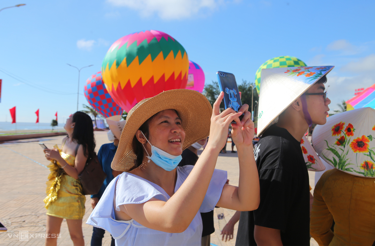 Phía dưới hàng trăm du khách chờ đến lượt trải nghiệm. "Lần đầu tôi đến Cửa Lò và trúng ngày hội nên tranh thủ trải nghiệm. Cảm giác tuyệt vời khi được đứng trong khinh khí cầu để cảm nhận khung cảnh phía dưới", anh Ngọc Tú, trú Hà Tĩnh, nói.