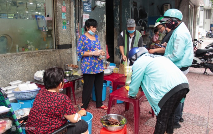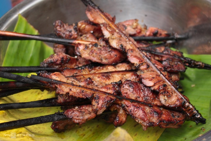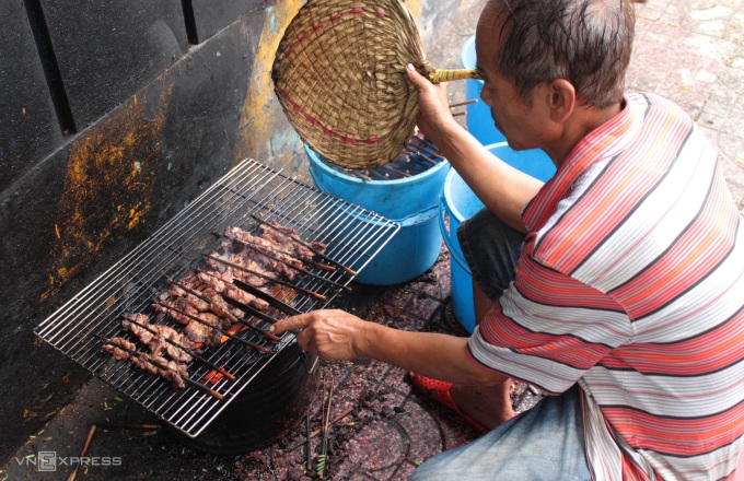 Cách đó không xa, ông Chơn, hơn 60 tuổi phụ trách nướng thịt. Thịt được nướng trên than hồng thơm mùi sả và mỡ cháy. Trước khi mang ra bàn cho khách, thịt được nướng hai lần. Một lần nướng sơ, sau đó nướng chín hẳn để thịt nóng hổi. "Vì quán đông khách nên mình làm không xuể, nếu nướng một lần thịt sẽ không kịp chín, khách chờ lâu. Nướng hai lần giúp tiết kiệm thời gian hơn", ông Chơn nói.
