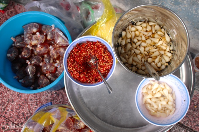 Nguyên liệu được làm sẵn bày trên bàn nhỏ để nhân viên tiện làm món cho khách. Theo cô Vân, chả giò, thịt nướng và nước mắm được làm theo công thức riêng mang khẩu vị miền Tây. Mỗi ngày, chủ và nhân viên dậy từ 5h để chuẩn bị nguyên liệu, ướp thịt, làm chả giò... đến 6h30 có món bán cho khách. "Tôi chọn nguyên liệu rất kỹ, mỗi ngày đều làm đồ tươi, không trữ lạnh", cô Vân nói.