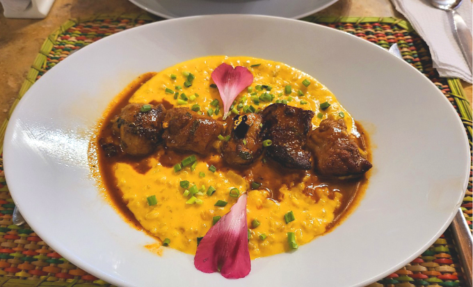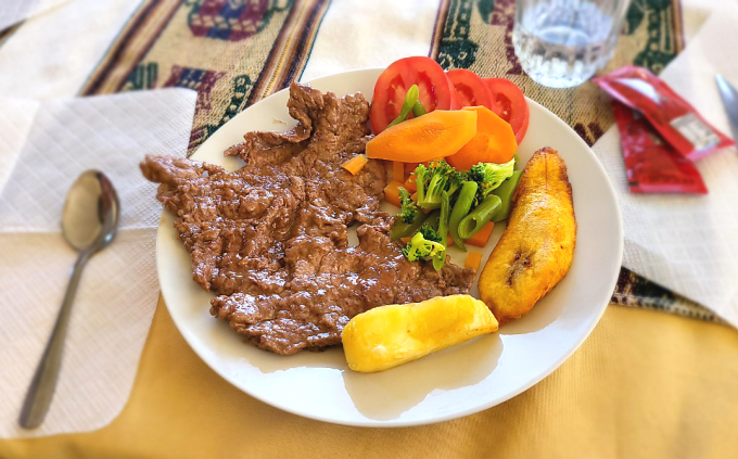Một cách chế biến bít tết llama tại nhà hàng Yaku, thành phố Cusco, Peru. Anh Tùng chia sẻ, Cusco ở Peru có nhiều nhà hàng chế biến llama nhưng ở Bolivia thịt llama và alpca mới là món được yêu thích. Bạn có thể thấy bít tết llama trong thực đơn tất cả các nhà hàng từ sang trọng đến bình dân, từ phong cách châu Âu đến phong cách bản địa. Nhiều nơi llama được sử dụng thay cho thịt bò. Một số nhà hàng mà anh Tùng đánh giá cao về chế biến món thịt này là Yaku ở Cusco (Peru), Apu Inti ở thị trấn Machu Picchu Pueblo (Peru) và nhà hàng Banais ở La Paz (Bolivia).