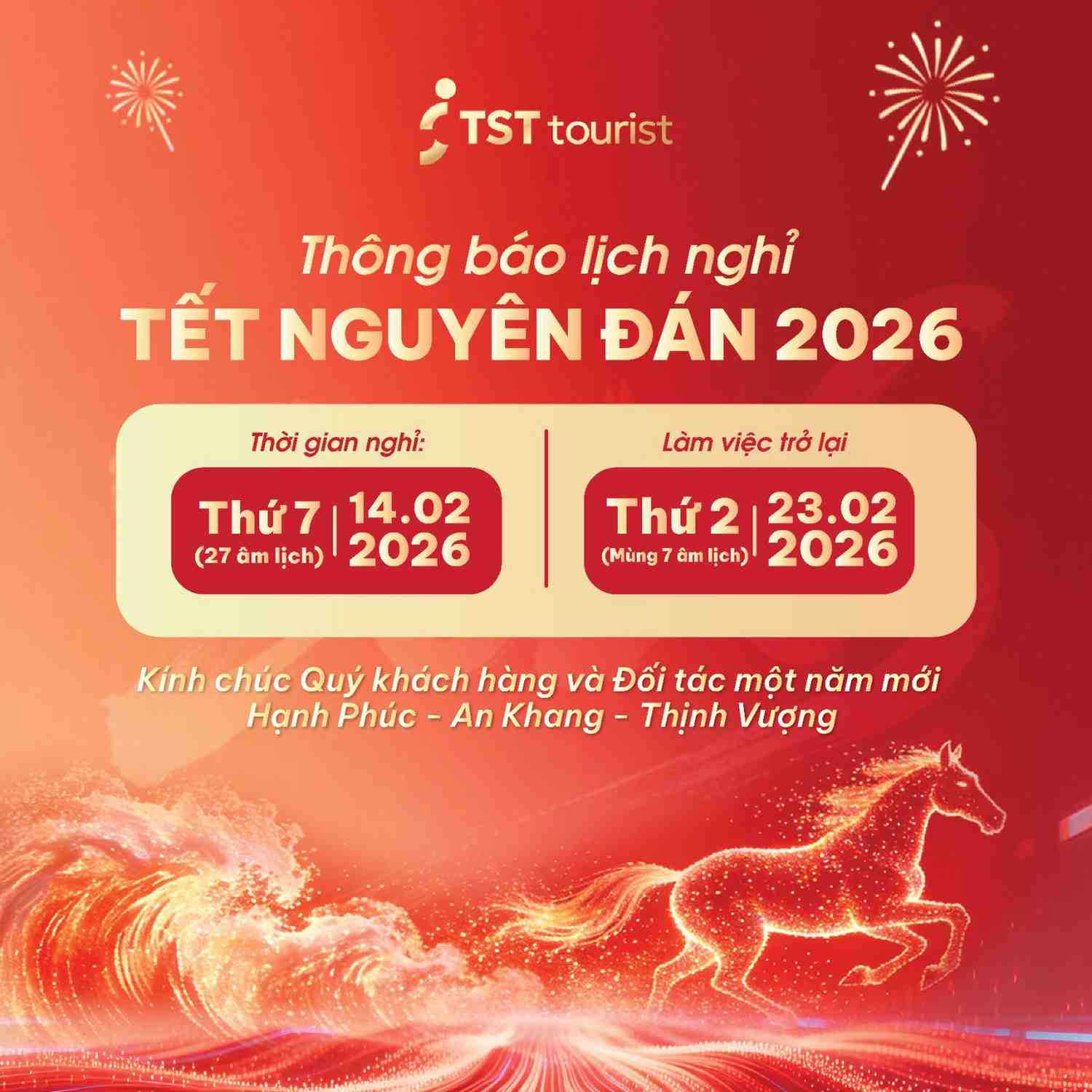 Nhân dịp Tết Nguyên đán Bính Ngọ 2026, TST Tourist trân trọng thông báo đến Quý Khách hàng và Đối tác lịch nghỉ Tết chính thức: