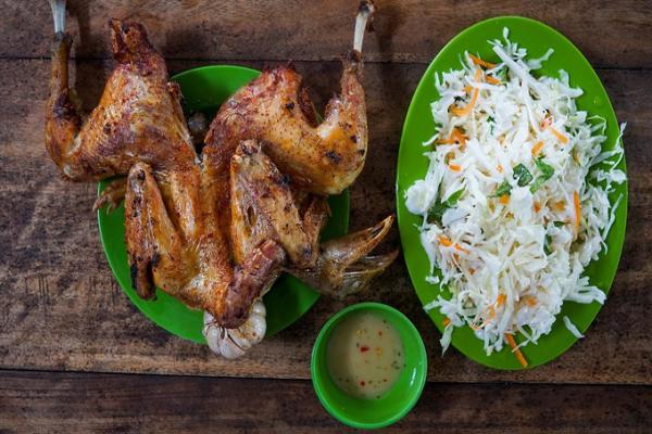 Ảnh: Quỳnh TrầnGà đốt là món ăn truyền thống của người Khmer ở An Giang. Gà được chọn phải là những con thả vườn khoảng 1,2 kg. Sau sơ chế, đầu bếp sẽ ướp gà với sả, ớt, tỏi, đường, muối với lượng vừa đủ, tuyệt nhiên không thể thiếu lá chúc (cùng họ với chanh) để món ăn có mùi vị riêng, chỉ ngon khi ăn ở An Giang.