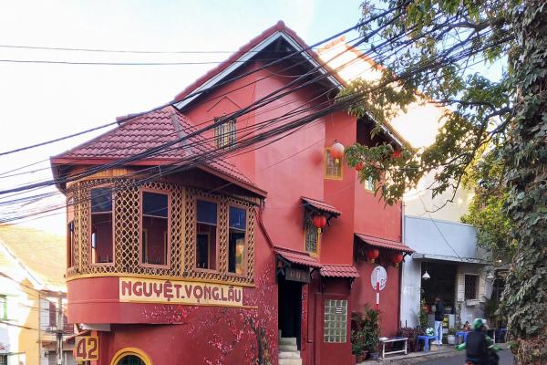 Nằm ngay góc phố Tăng Bạt Hổ rẽ ra Trương Công Định, phường 1 là con dốc nhỏ có ngôi nhà màu đỏ mang tên Nguyệt Vọng Lầu rất nổi bật. Vốn là một quán chè của người Hoa, ngôi nhà hai tầng với đèn lồng đỏ treo cao và tranh tường trở thành điểm check-in của nhiều bạn trẻ mỗi lần tới Đà Lạt. Ảnh: Khánh Trần