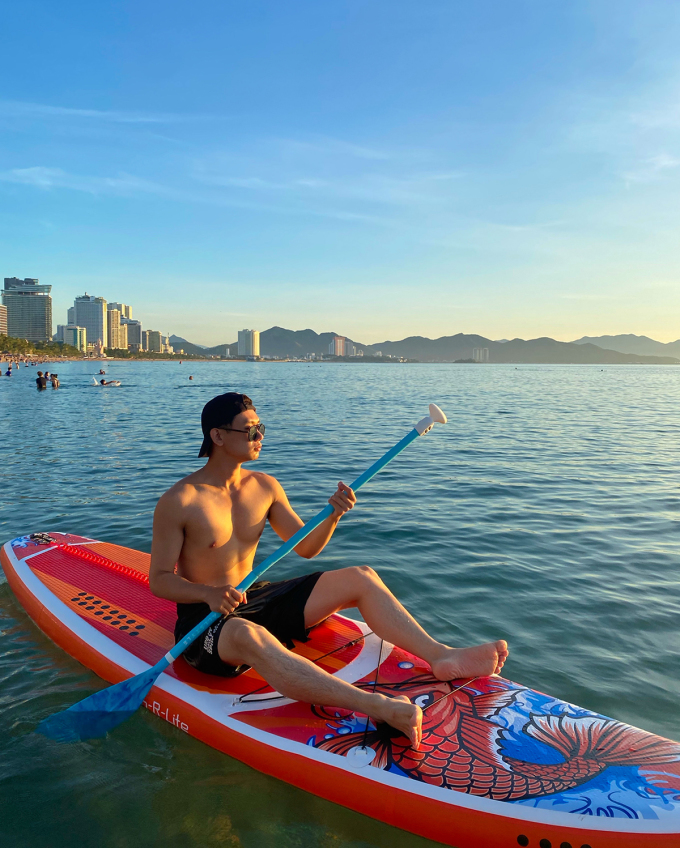 Ngày thứ 2, Định dậy từ 5h sáng, quay lại Z Beach để chèo SUP ngắm bình minh. Đây là trải nghiệm anh thích nhất trong chuyến đi và cũng là một trong những lý do chính mà nhóm Định chọn đến Nha Trang du lịch. "Cảm giác lênh đênh trên biển ngắm trọn mặt trời thức dậy, sau đó dần dần tấp nập người đến bơi lội vui chơi, vừa lãng mạn vừa sầm uất. Mình yêu không khí tại đây", Định nhận xét.