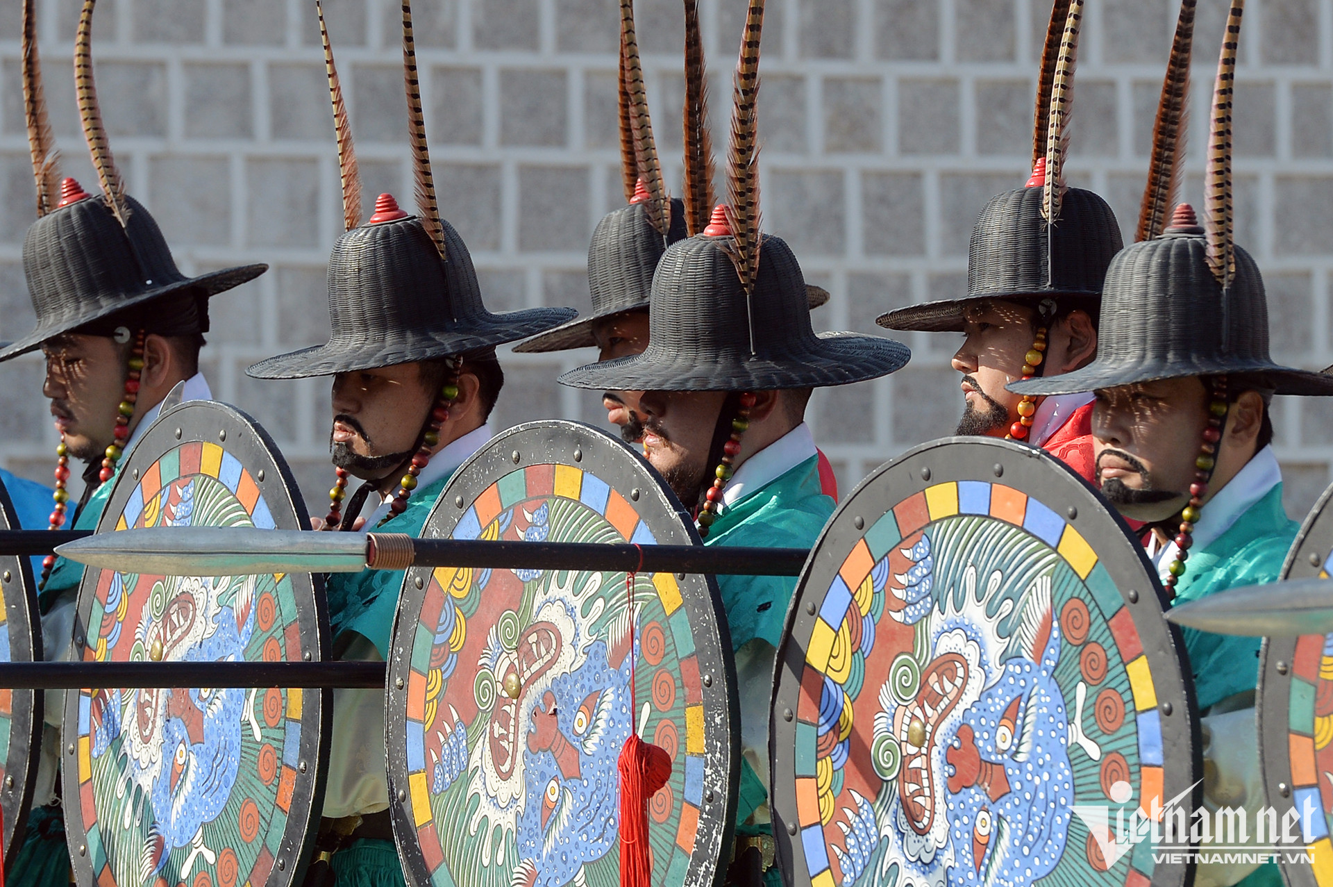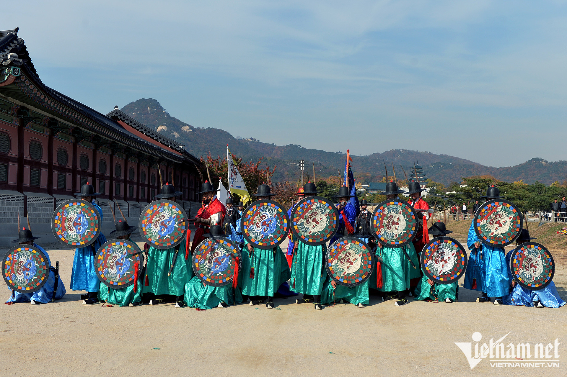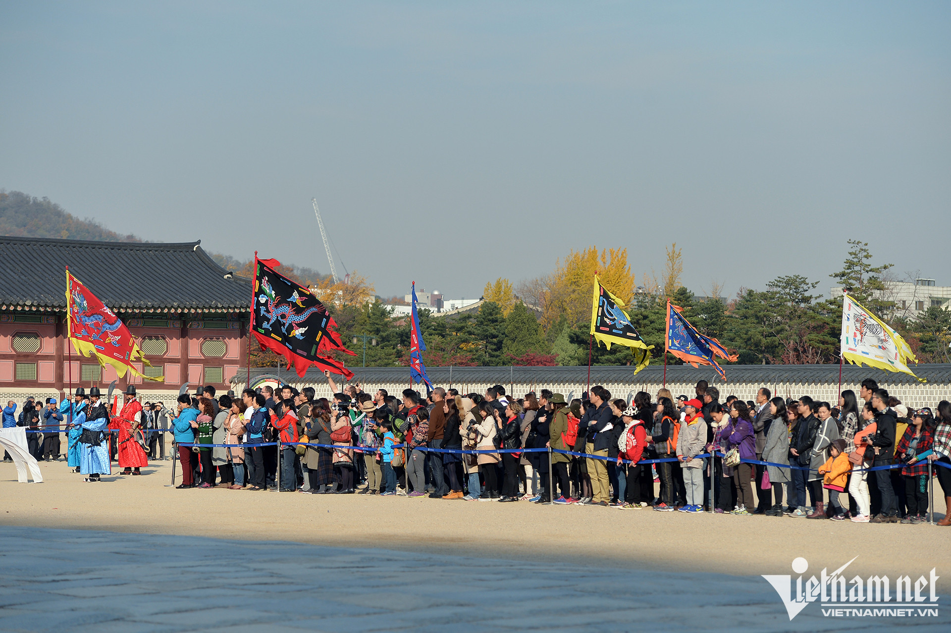 Lính canh Hoàng gia mặc phục trang giống như thời Joseon bước ra từ phía sau của cung. Du khách có thể phân biệt tướng và lính qua trang phục. Trong ảnh, vị trấn tướng đội mũ đỏ luôn đứng trong tư thế oai nghiêm, mắt nhìn thẳng về phía trước, chỉ cử động khi cần đi lại để chỉ đạo.