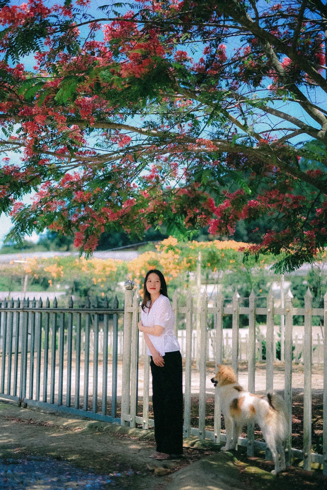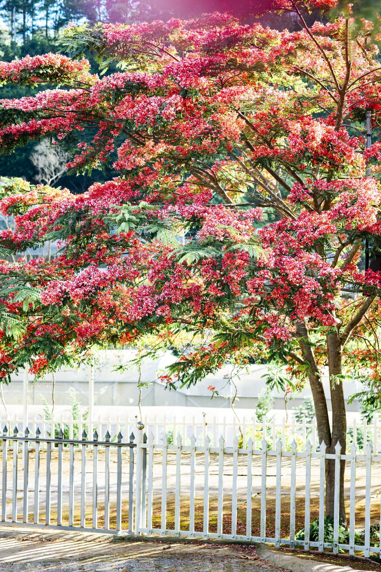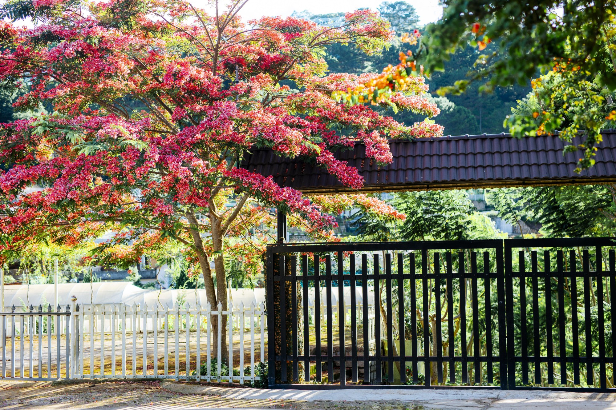 Một cây phượng hồng nằm tại cuối đường Trần Thái Tông (phường 9, Đà Lạt, Lâm Đồng) đang gây sốt trên mạng xã hội khi bung nở rực rỡ. Cây phượng nằm sát cổng gỗ đen và hàng rào trắng xinh xắn tạo thành bối cảnh check-in lý tưởng cho du khách (Ảnh: Đồng Ngô)