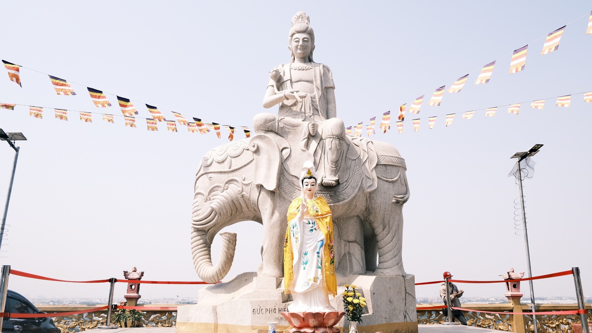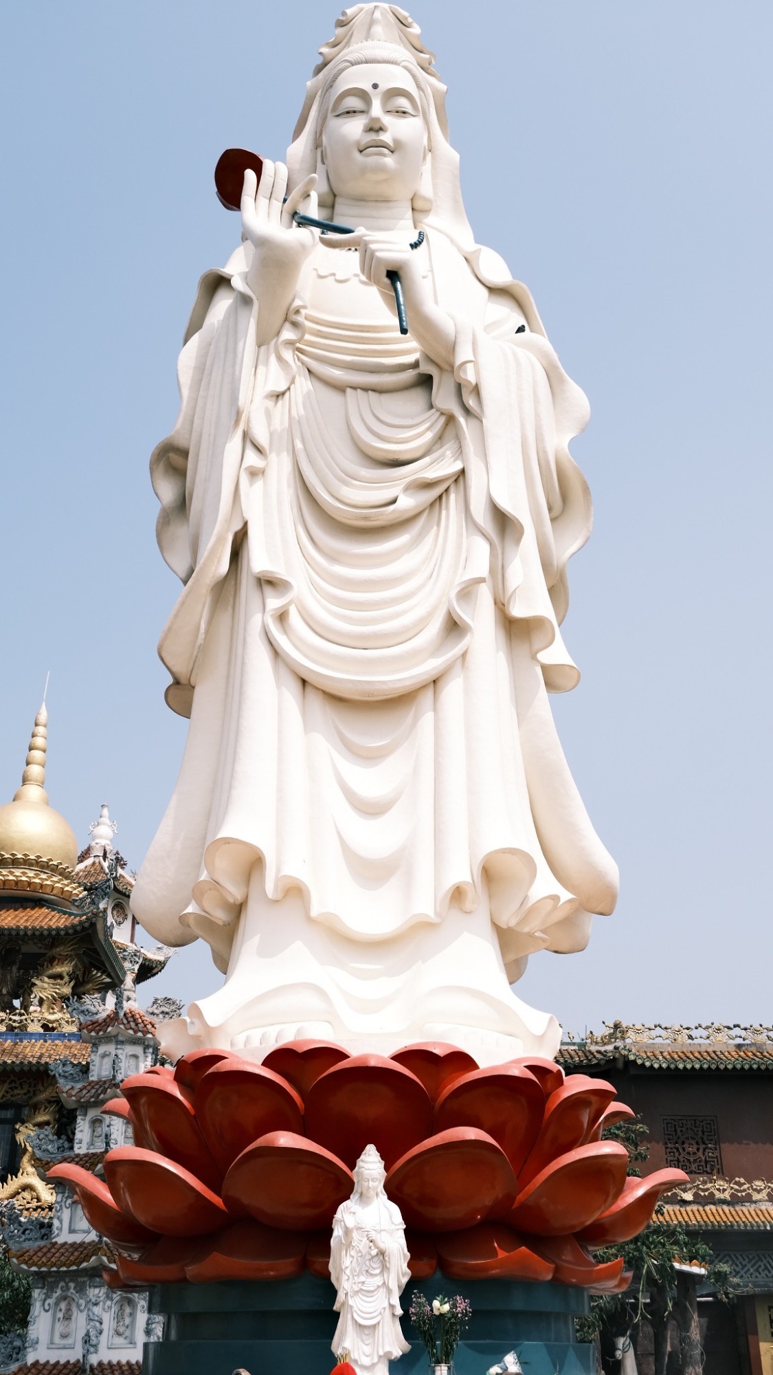 Tượng Quan âm Bồ tát lộ trên tòa sen cao tới 22,5m ở sân chùa
