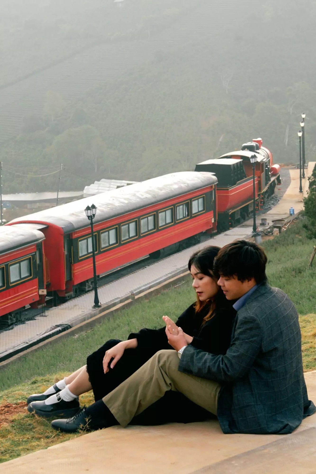 Ảnh: Viên Diệu PhátCặp đôi Nguyên - Hân di chuyển từ TPHCM lên Đà Lạt du lịch và chụp ảnh kỉ niệm. Hình ảnh đoàn tàu đỏ nằm giữa đồi hoa khiến họ mê mẩn. "Đây là đoàn tàu thật được cải tạo, trùng tu nên nhìn vô cùng tự nhiên. Khi chụp hình cho khách tại đây, mình cảm giác như đang ở một nhà ga đầy mộng mơ", nhiếp ảnh gia Viên Diệu Phát (TPHCM) chia sẻ.