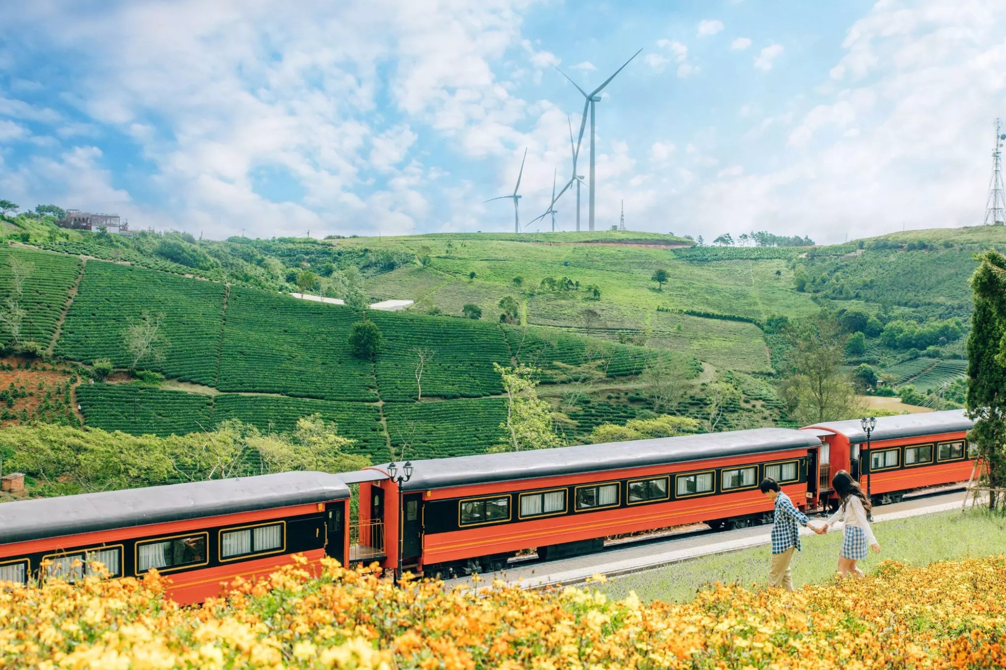 Từ toa tàu, du khách có thể ngắm cánh đồng hoa hoặc đồi chè.