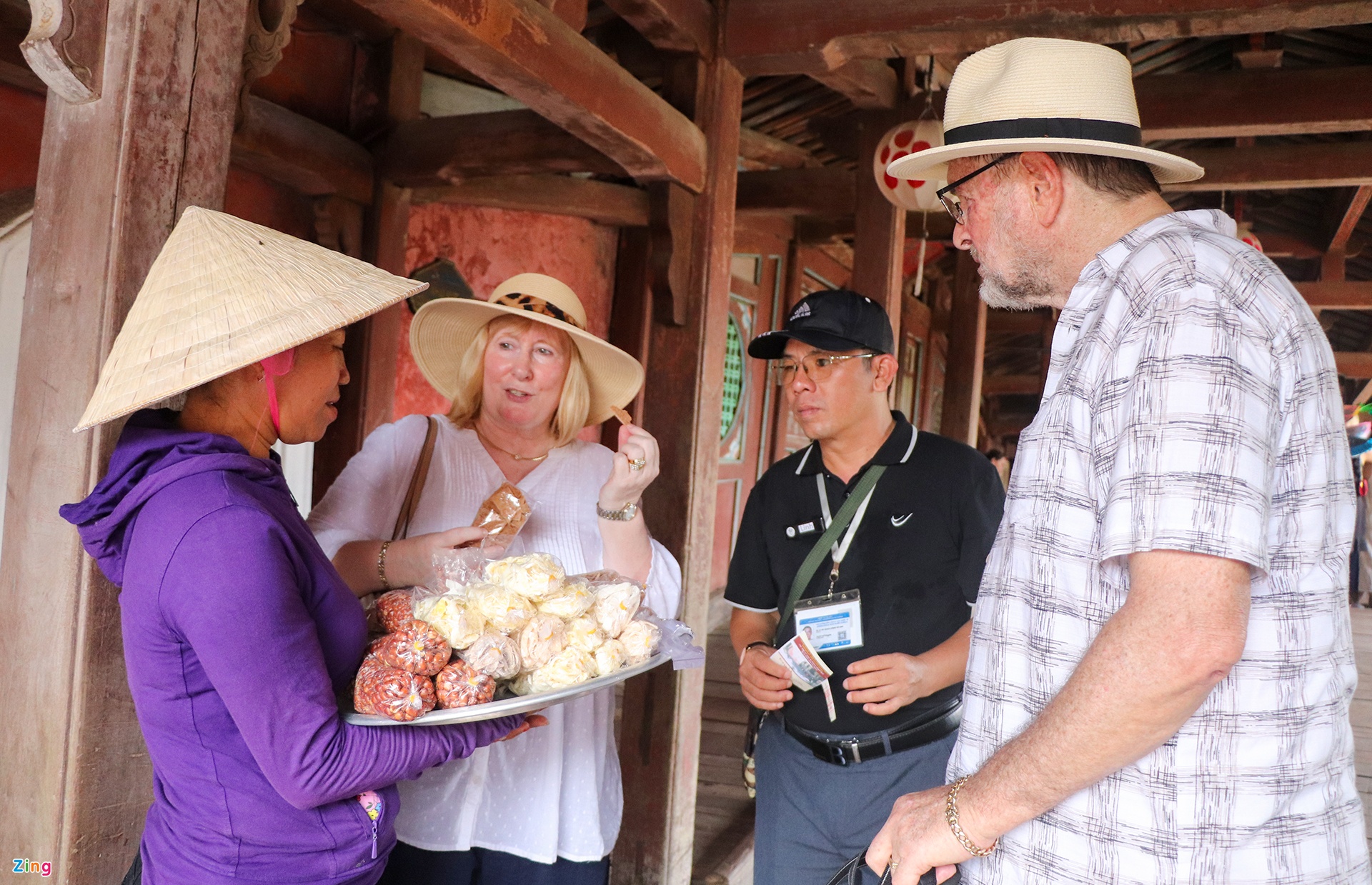 Sau khi tham quan nhà cổ Tấn Ký, nhóm du khách lựa chọn những đồng xu may mắn được bày bán tại nhà cổ.