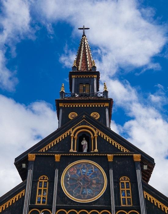 Được làm hoàn toàn bằng gỗ cà chít nên công trình hay được gọi là nhà thờ gỗ. Kiến trúc sư thiết kế khu nhà theo phong cách Roman kết hợp với kiến trúc nhà sàn của người Ba Na. Trên đỉnh tháp là cây thánh giá bằng gỗ quý cao vút, thể hiện sự uy nghiêm và vĩnh cửu của ngôi thánh đường.