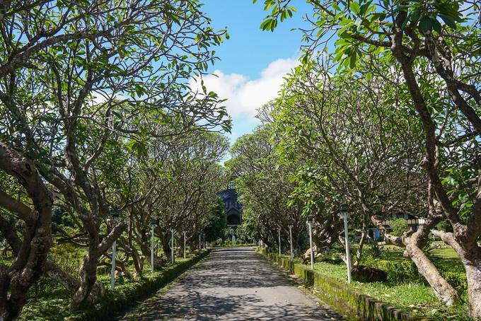 Bao quanh Tòa giám mục là khuôn viên rộng với nhiều cây lâu năm. Nổi bật là hai hàng cây sứ rợp bóng mát ở lối vào, mang đến vẻ bình yên, tĩnh lặng. Tòa Giám mục Kon Tum đóng cửa vào thứ 3, các ngày còn lại trong tuần đều mở cửa đón khách tham quan.
