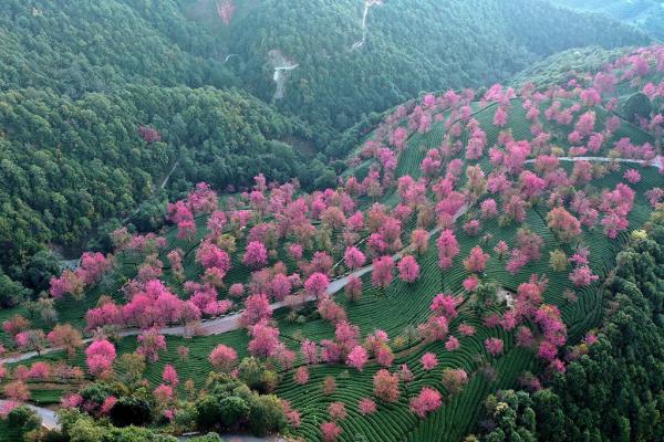 Ở tỉnh Vân Nam nhiều nơi hoa anh đào đã rộ nở, tô sắc hồng rực rỡ từ đường phố Côn Minh cho tới những đồi chè trên núi Yiliang.