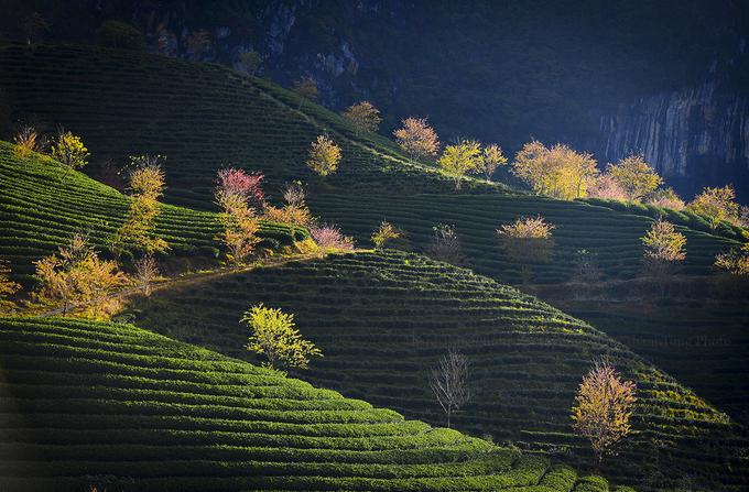 Những tia nắng đầu tiên của ngày mới chiếu lên vườn chè cũng là lúc màu sắc của những cánh hoa mai anh đào trông rực rỡ nhất.