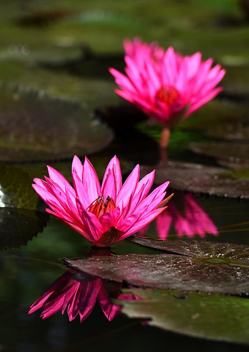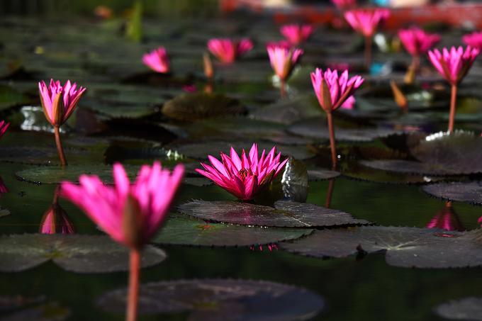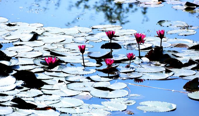 Hoa súng thường nở lúc bình minh, vươn khỏi mặt nước chừng 10-20 cm. Lá súng còn non có màu nâu đỏ rồi dần chuyển sang sắc xanh bóng mượt, bồng bềnh trên mặt nước.