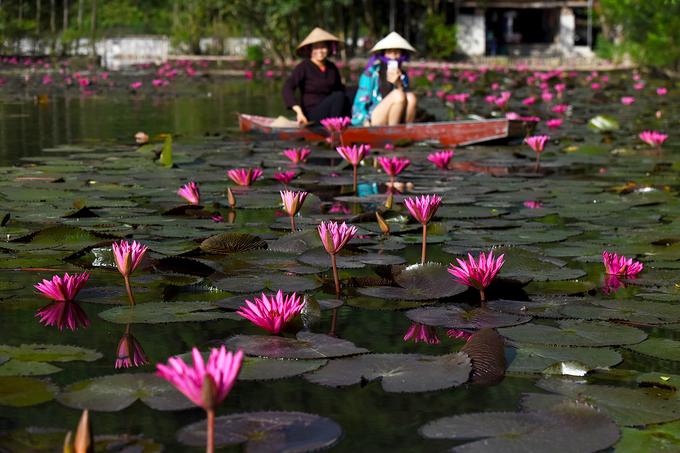 Khác với vẻ tấp nập vào mùa xuân, mùa này ở chùa Hương tĩnh lặng, thanh bình, đón du khách tới đây thưởng ngoạn vẻ đẹp của những bông hoa súng hồng, tím. Thuê một chiếc thuyền nhỏ với một người chèo giá khoảng 100.000-120.000 đồng, mỗi thuyền ngồi 2 người.
