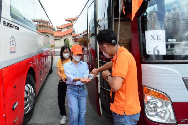 Du khách rửa tay khử khuẩn trước khi lên xe đi tham quan. Ảnh: TSTtourist Từ 19/9 đến nay, ngành du lịch TP HCM đã tổ chức thành công 20 chương trình du lịch thí điểm là các tour khép kín tri ân y bác sĩ tuyến đầu chống dịch, nhiều hướng dẫn viên đã quay trở lại với công việc và các doanh nghiệp lữ hành cũng tái khởi động các văn phòng bán tour cũng như dịch vụ du lịch trên toàn quốc.