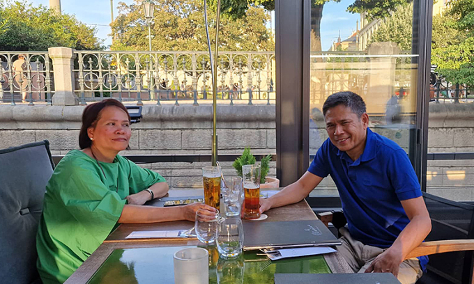Anh Thịnh và vợ, chị Phương giải nhiệt ngày hè trong một quán bia ở Prague, CH Czech. Anh cho biết trong quán cũng có rất nhiều khách du lịch ghé thăm để uống bia cho mát vào những ngày nắng nóng. Giá bia ở Prague là 1,4 euro/nửa lít. Ảnh: NVCC