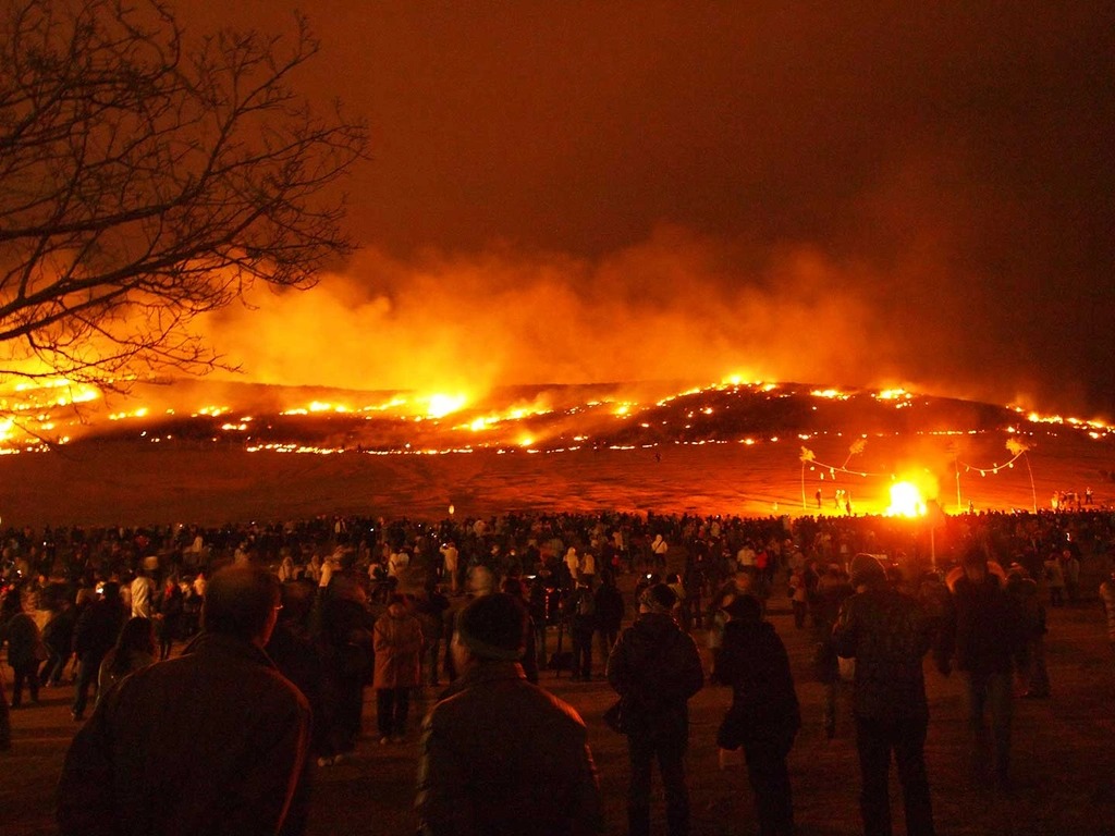 Wakakusa Yamayaki là một lễ hội thường niên nổi tiếng với nghi lễ đốt núi độc đáo. Trong lễ hội diễn ra vào ngày thứ bảy, tuần thứ 4 của tháng 1, cỏ trên khắp sườn núi Wakakusayama bị đốt cháy, sau đó là một màn bắn pháo hoa rợp trời. Ảnh: Gltjp.