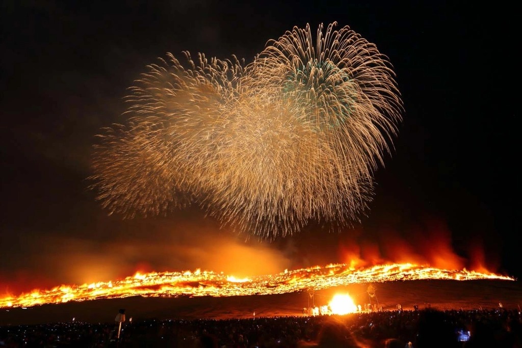 Sau khi những ngọn cỏ dưới chân núi Wakakusa bắt lửa và bùng cháy, một màn bắn pháo hoa kéo dài 15 phút diễn ra, tạo nên cảnh tượng ánh sáng huyền ảo. Tùy thuộc vào tình trạng của cỏ trên núi, cả khu vực sẽ bị đốt cháy hoàn toàn trong 30 phút đến một giờ. Ảnh: Zekkei Japan.
