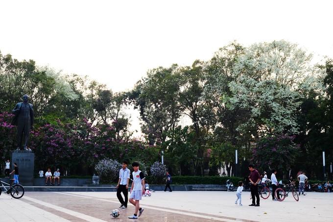 Xung quanh tượng đài trong công viên Lenin, bạn cũng tìm thấy nhiều cây sưa đang rộ nở, xen lẫn những cây hoa ban tím, nếu đi trên đường Điện Biên Phủ.