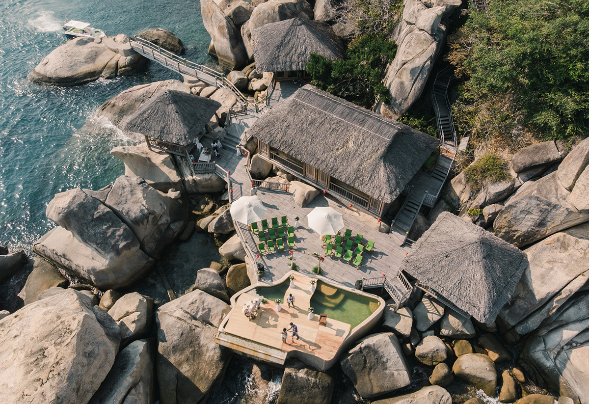 Khu nghỉ làm nổi bật không khí nguyên sơ của vịnh Vĩnh Hy qua các không gian ngoài trời, từ các nhà hàng và hồ bơi trên đỉnh vách đá, đến spa bên hồ và bãi biển riêng. Các khu vực trải nghiệm tách biệt nhau, chia rõ chủ đề để du khách có không gian riêng tư nhất.