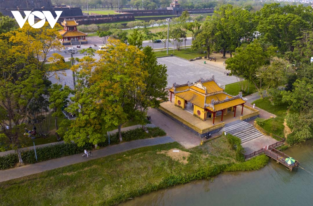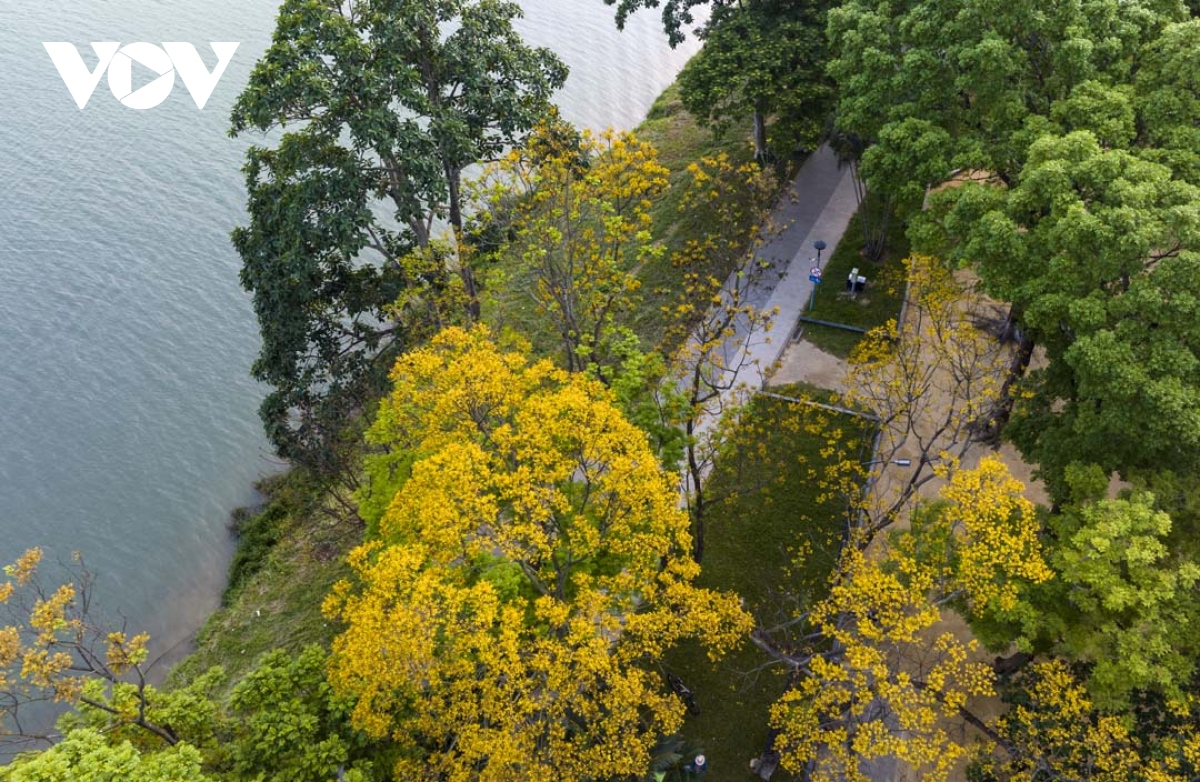 Sắc vàng rực rỡ đường đi bộ ven dòng Hương.