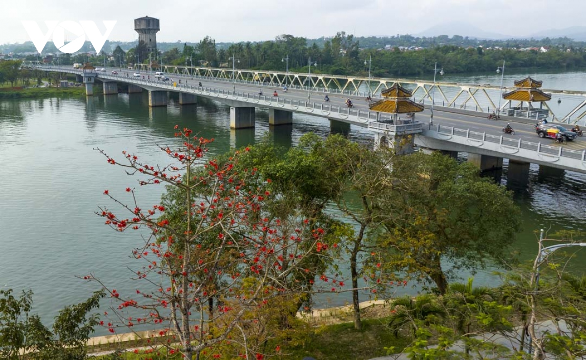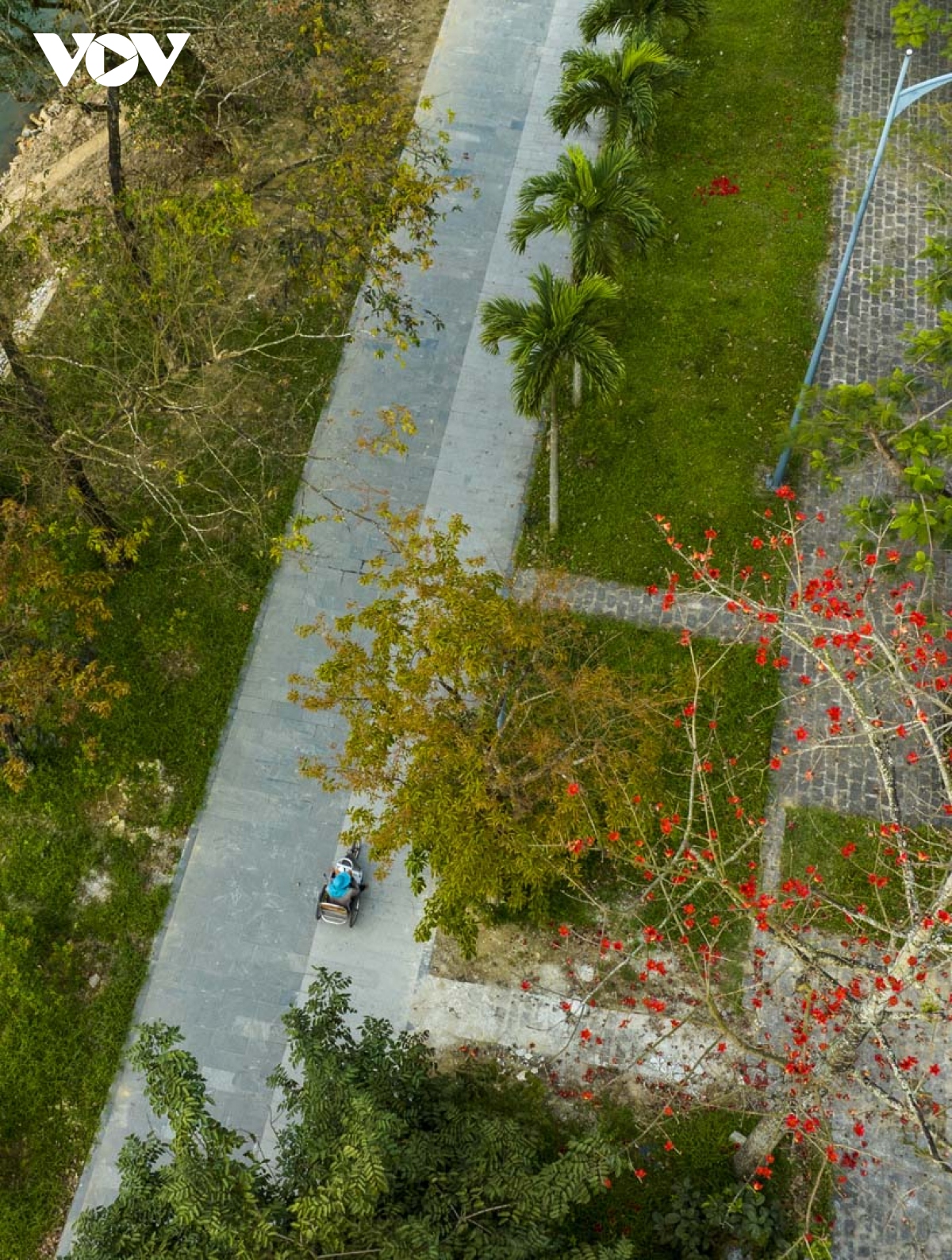 Sắc đỏ điểm xuyết đường đi bộ dọc sông Hương.