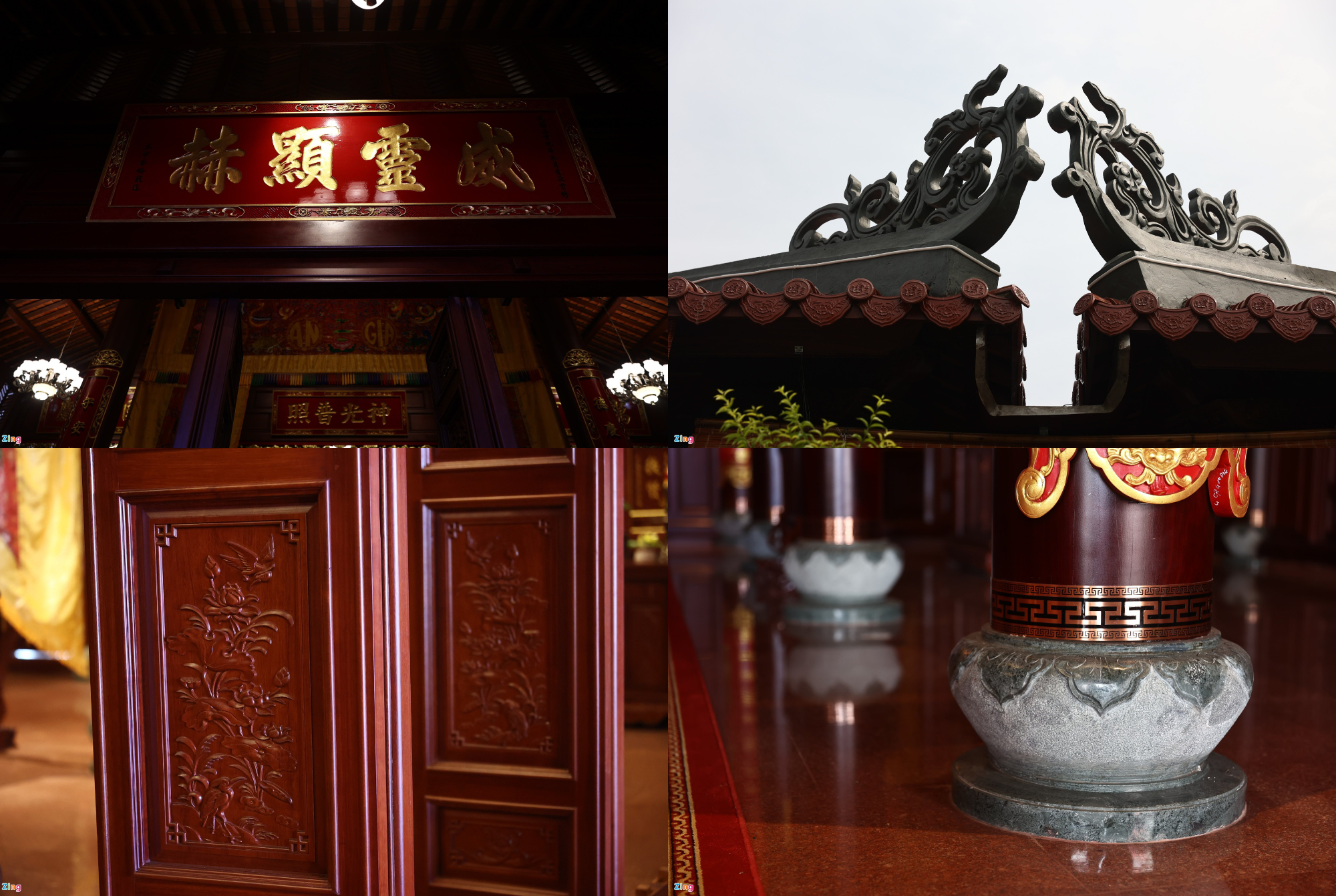 Phần tường được dựng hoàn toàn bằng gỗ. Hệ thống trụ có bệ đá đồng bộ với sàn bên ngoài chánh điện.