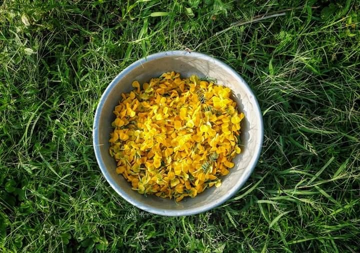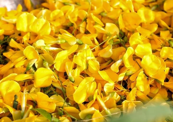 Cá linh không thể thiếu bông điên điển. Dường như cả hai được sinh ra trong mùa nước nổi để kết hợp cùng nhau. Cây điên điển mọc hoang bên bờ kênh, bờ sông, bờ ao đợi những cơn mưa đầu mùa báo hiệu nước ròng thì bỗng chốc trổ bông, nở vàng rực rỡ (ảnh: HUỆ MẪN).