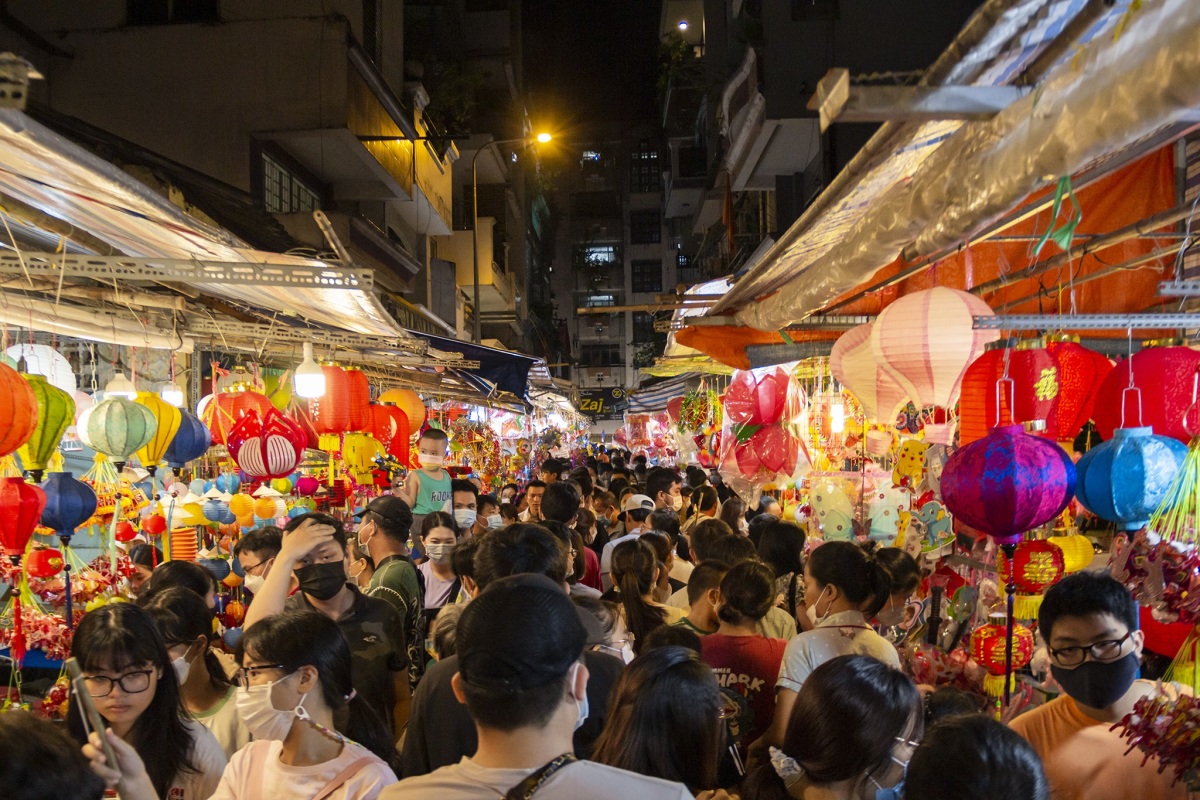 Khu phố lồng đèn Lương Nhữ Học tấp nập người dân, trẻ em đi chơi, mua sắm trong dịp lễ 2/9, cận Trung thu.