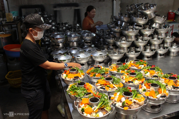 Lẩu cù lao được xếp sẵn nguyên liệu, khách gọi sẽ thêm nước lẩu và mang ra bàn phục vụ - Ảnh: Huỳnh NhiMỗi ngày, nhân viên quán bắt đầu từ 7h để làm sạch rau, nguyên liệu và nấu nước dùng lẩu cù lao, lẩu mắm, lẩu thái. Đứng bếp chính là mẹ của My và người thân trong gia đình. Nói về món "đinh" của quán là lẩu cù lao, cô Lệ cho biết: