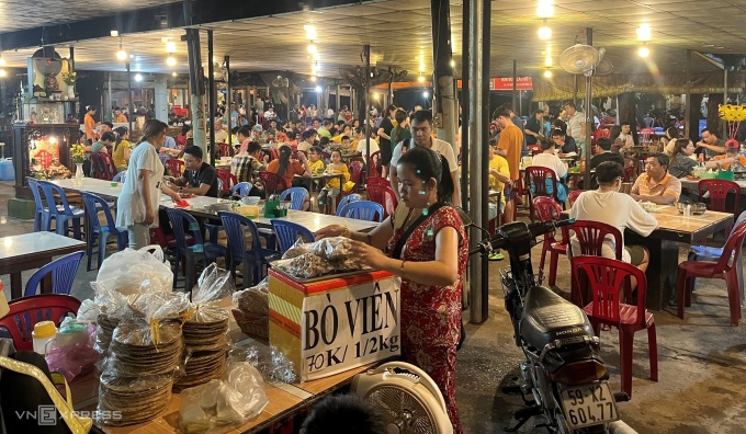 Một góc quán vào giờ cao điểm lúc 18h. Ảnh: Huỳnh Nhi"Lần đầu tới đây, mình thấy như bước vào chợ hay công ty, xí nghiệp, xưởng gì đó chứ không phải quán ăn, đó giờ chưa thấy quán nào rộng như vậy", Quốc Khanh, sống ở TP Thủ Đức, nói khi nhìn các dãy bàn xếp cạnh nhau trong và ngoài sân vườn, rộng tới 400 m2. Một số thực khách khác cho biết quán này đã có từ hàng chục năm trước. Họ thường ghé ăn khi có dịp đi Bình Dương hay Đồng Nai, món chất lượng và giá phải chăng là điều khiến họ ấn tượng và quay lại nhiều lần.