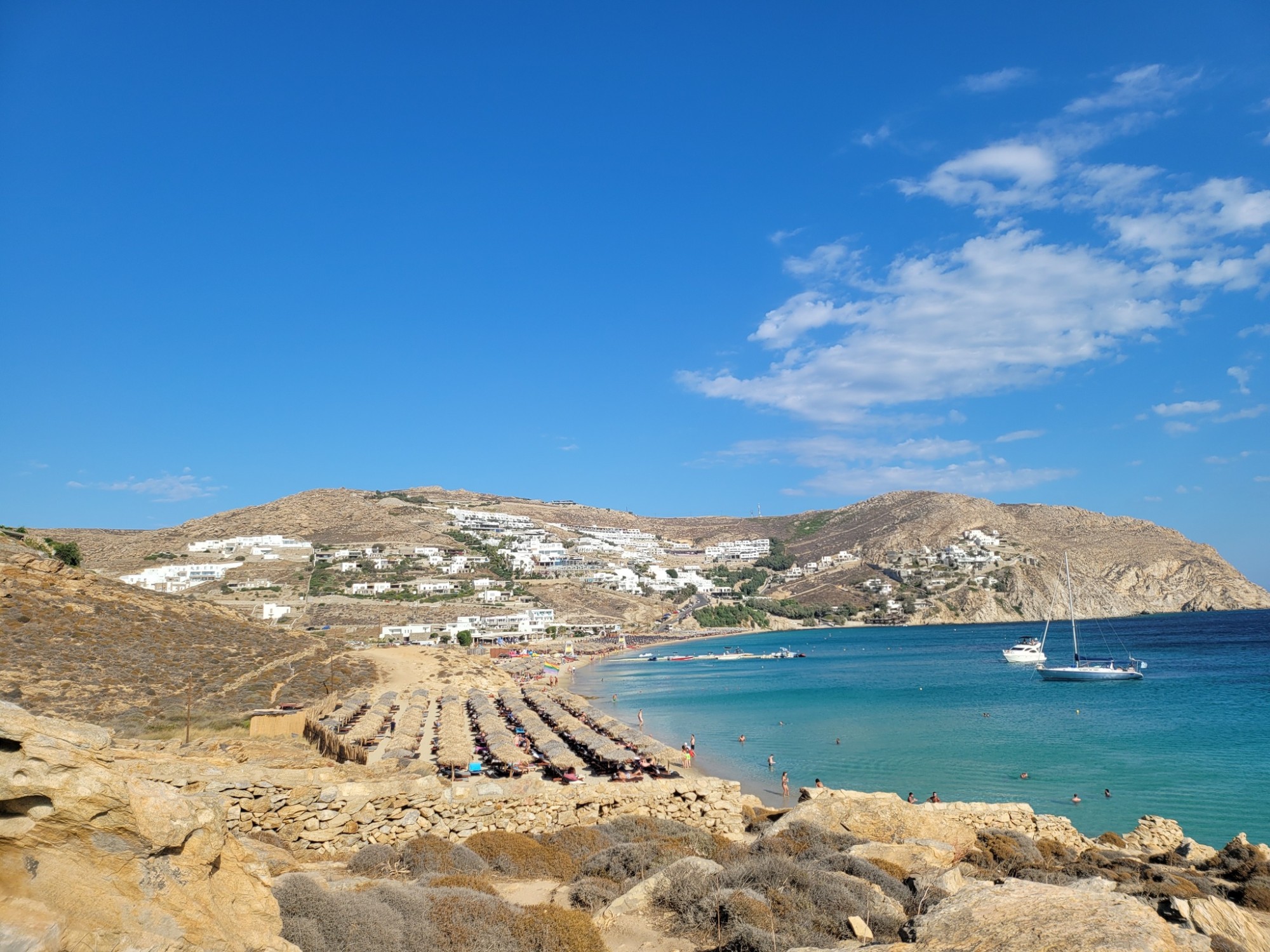 Mykonos có nhiều bãi biển đẹp, cách biệt khu dân cư, mùa hè nước ấm, như Elia - bãi biển dài nhất hòn đảo và các bãi tắm như Psarou, Baraga, Paradise… Little Venice (Venice nhỏ) là địa điểm lãng mạn ở Mykonos, nằm ở phía tây của khu Chora trên bờ biển Aegean. Vào thế kỷ 18, nhiều nhà buôn đã xây những căn nhà của mình trên rìa của bờ biển, sát mép nước, giống như người dân ở Venice, Ý đã làm. Họ cũng sử dụng kiểu kiến trúc của người Venetians để xây nhà và vì thế mang lại cảm giác "rất Venice". Đây cũng là khu vực du khách đổ về để ngắm hoàng hôn mỗi chiều.